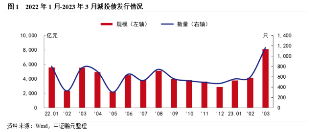 2023年3月份,各品種城投債共發(fā)行1,166只,發(fā)行規(guī)模8,118.42億元,發(fā)行數(shù)量同比增長50%、發(fā)行規(guī)模同比增長46%,環(huán)比分別增長96%和97%。綜合2023年1-3月,各品種城投債共發(fā)行2,319只,發(fā)行規(guī)模1.60萬億元,累計同比分別增長22%和19%。自2021年下半年以來,城投債融資政策處于收緊狀態(tài),發(fā)行規(guī)模呈現(xiàn)下降趨勢,3月份超過8000億元的發(fā)行規(guī)模為近5年來最高單月發(fā)行水平,主要因2023年3-4月份城投債進入歷史償債高峰,借新還舊需求帶動發(fā)行規(guī)模大增。