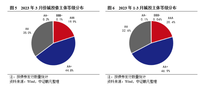 2023年3月份,城投債發(fā)行主體AA+級以上級別合計占比達到64.8%,較上月下降8.3pct。具體看,AAA主體發(fā)債232只,占比19.9%,較上月下降1.7pct;AA+主體發(fā)債522只,占比44.8%,較上月下降6.6pct;AA主體發(fā)債407只,占比35.0%,較上月上升8.1pct;3月份,仍有3只AA-級及以下主體債券,占比0.3%。