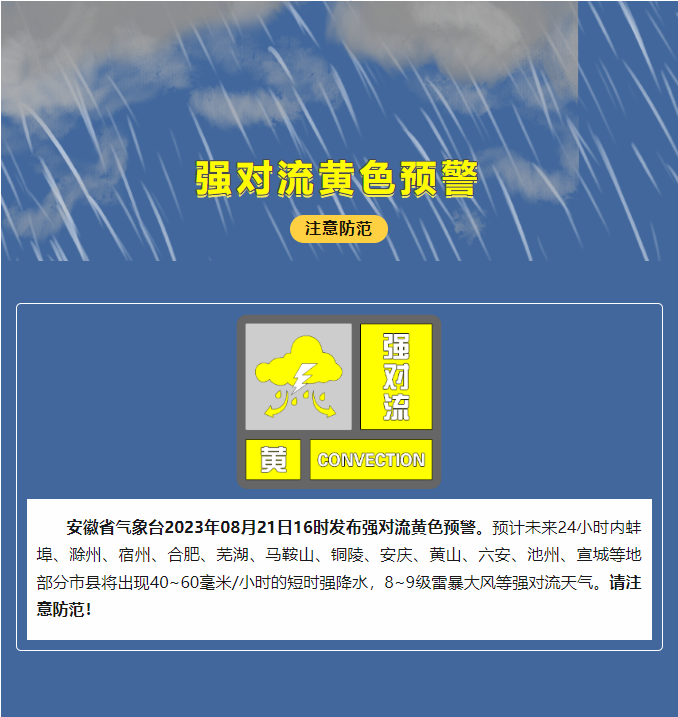 安徽省氣象臺2023年08月21日16時發(fā)布強對流黃色預警