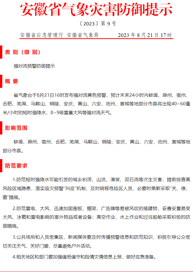 安徽省氣象臺2023年08月21日16時發(fā)布強對流黃色預警