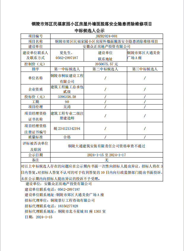 銅陵市郊區(qū)民福家園小區(qū)房屋外墻面脫落安全隱患消除維修項(xiàng)目中標(biāo)候選人公示?