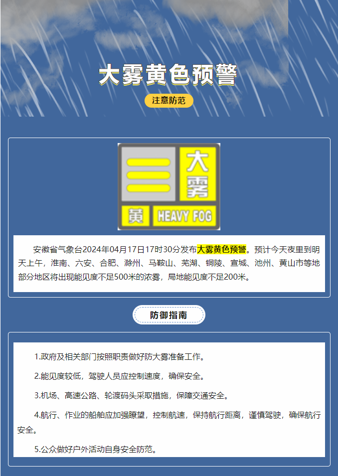轉(zhuǎn)載:安徽省氣象臺發(fā)布大霧黃色預警